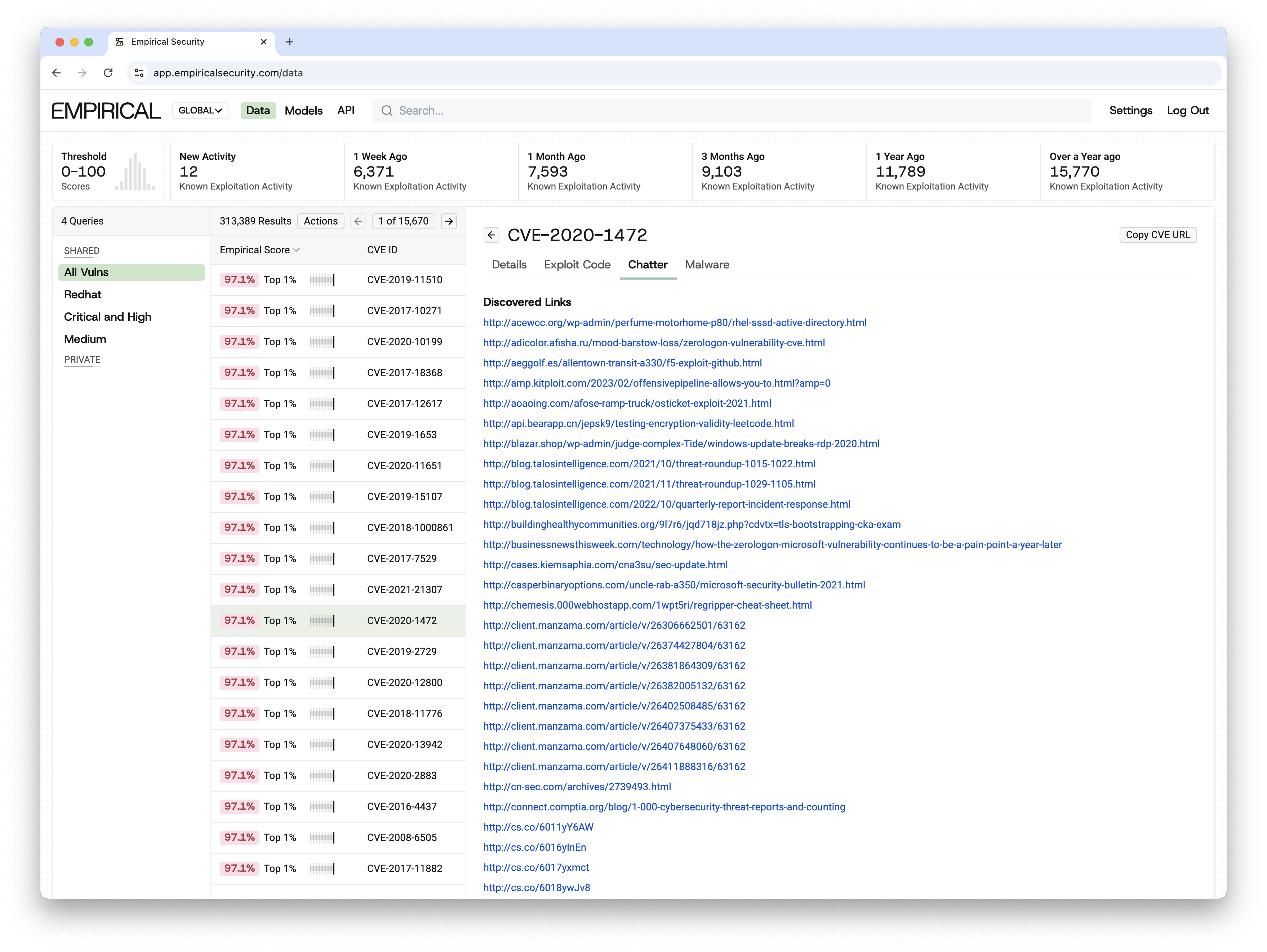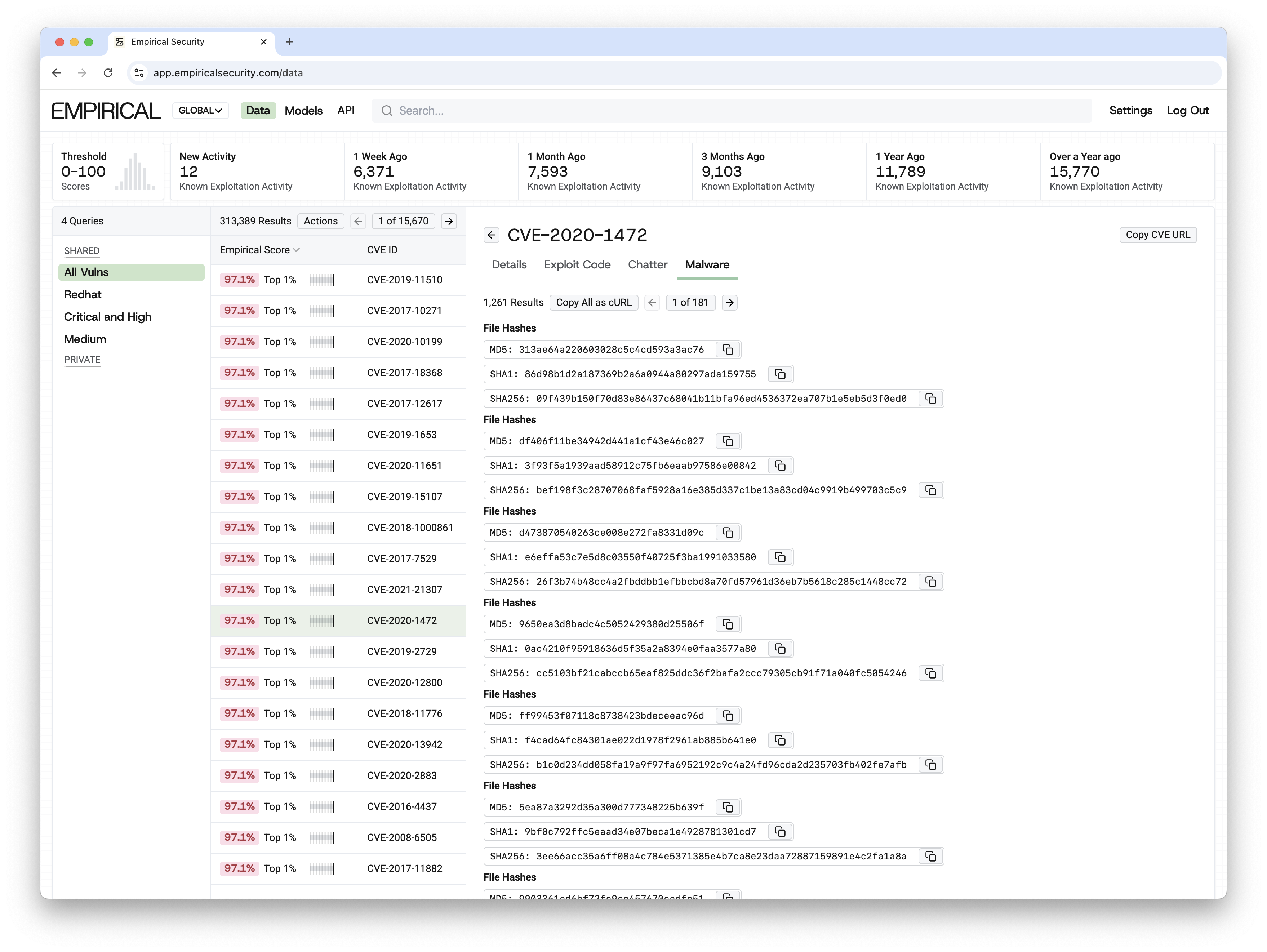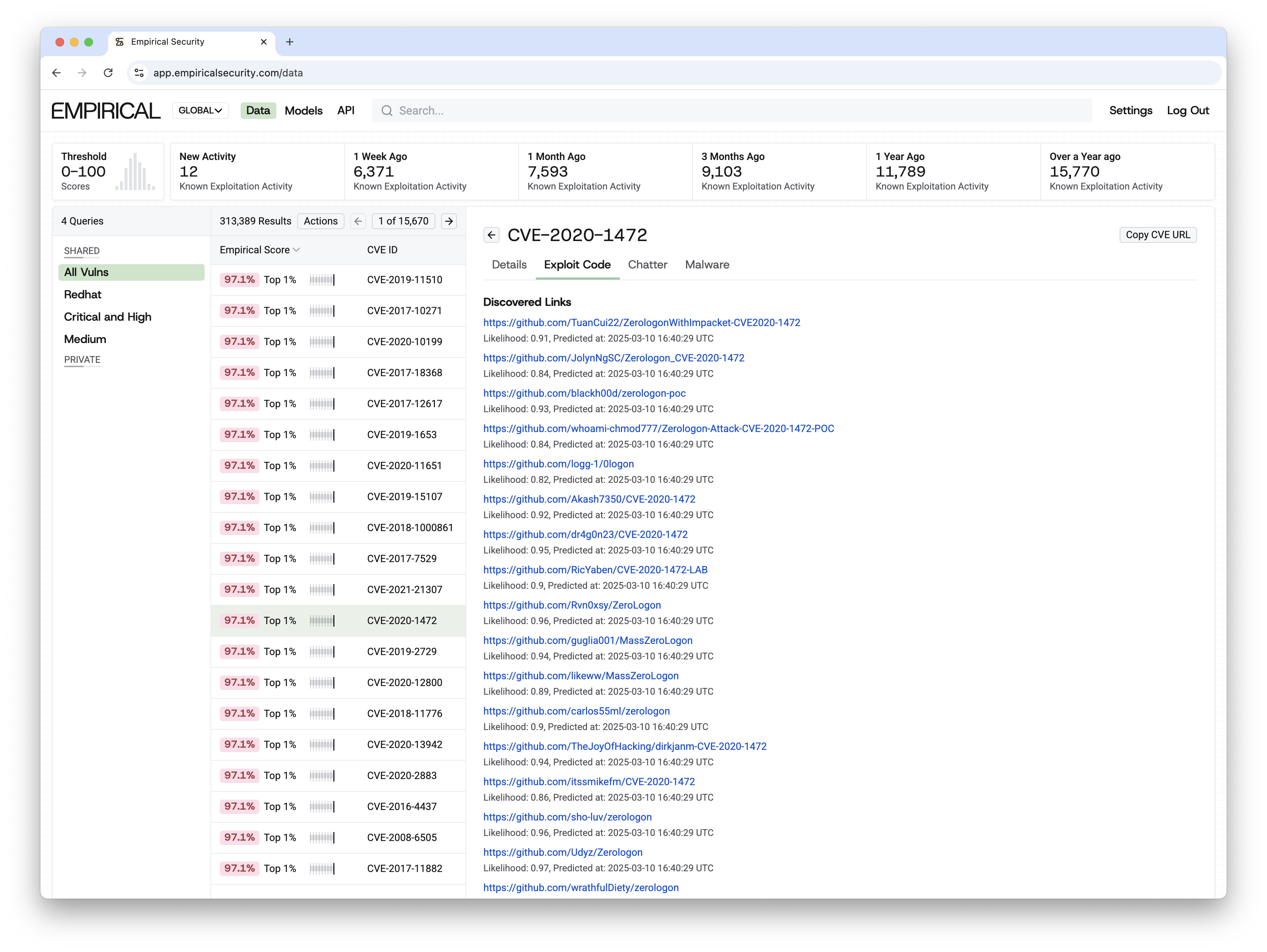 Empirical monitors activity on over 17,000 exploited CVEs—10 times more than the next best model—and offers hourly exploitation evidence and volume, an industry first.